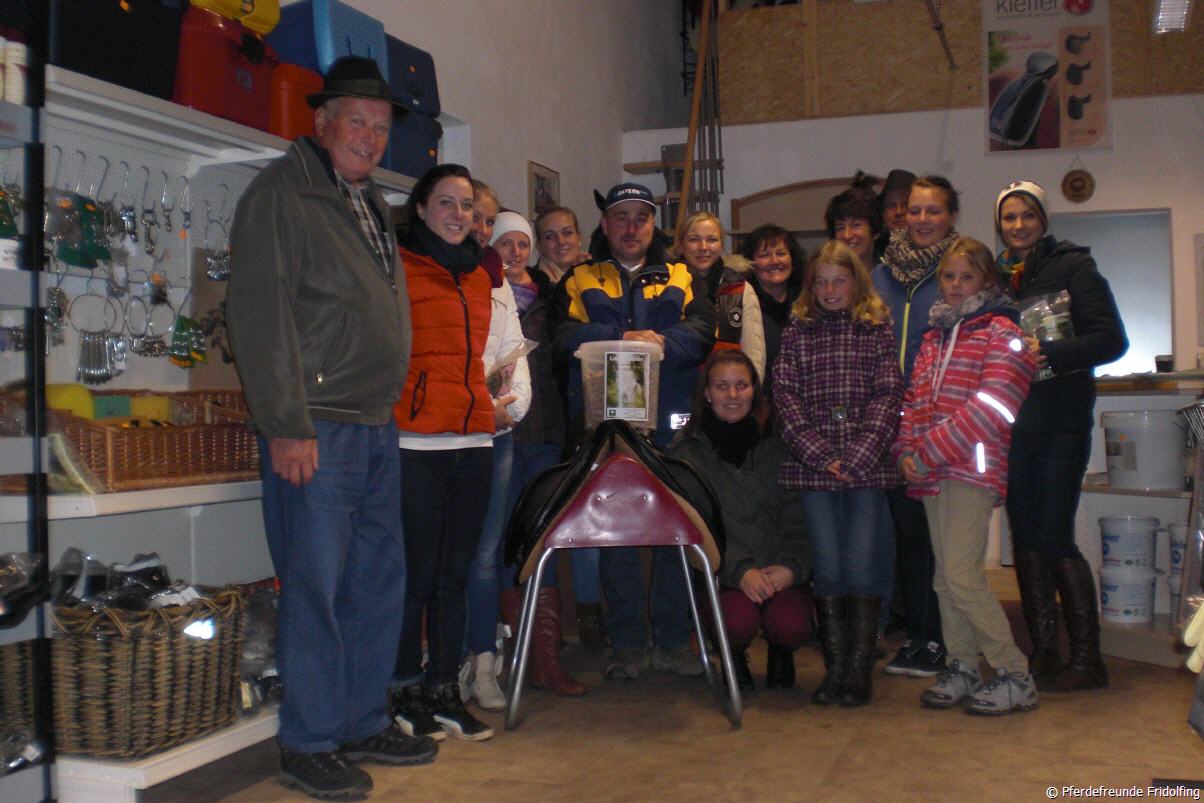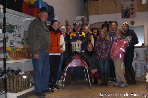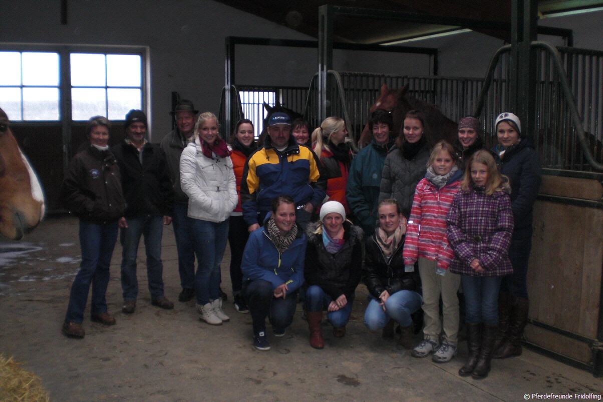 Die Pferdefreunde trafen sich am Samstag, den 27.10.12, mittags am Reitplatz in Fridolfing, wo sie dann gemeinsam ihren Vereinsausflug starteten. Das erste Ziel war der Zuchthof Galneder in Taufkirchen, welcher sich mit der Zucht, Aufzucht und Ausbildung von hoffnungsvollen Sportpferden beschäftigt. Zuerst wurde der Stall mit den jungen Pferden besichtigt. Allein aus diesem Jahr waren hier 21 Fohlen zu bestaunen und noch ca. 40 weitere aus den zwei Jahren zuvor. Außerdem wurden die aktuellen Zuchtstuten in einem weiteren Gebäude gezeigt und zum Schluss ging es dann in den Stall mit den sich im Sport befindlichen Pferden. Um die Pferde dann auch noch in Aktion betrachten zu können, zeigte Herr Galneder noch 3 Pferde in der Halle beim freien Springen, darunter auch zwei vom Vorstand Franz Mayer selbst Gezogene. Das nächste Ziel war dann der Pferdefutterfachbetrieb von Georg Holzner. Nach der Besichtigung der Lagerhalle ging es weiter in den warmen und trockenen Verkaufsladen, wo dann näher auf die verschiedenen Futtermittel und deren Herstellung eingegangen wurde. Zuletzt durfte auch noch die direkte Produktion angesehen werden, was für alle eine interessante Erfahrung war. Den Abschluss fand der Tag schließlich in einem gemeinsamen Essen.