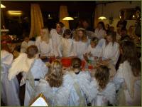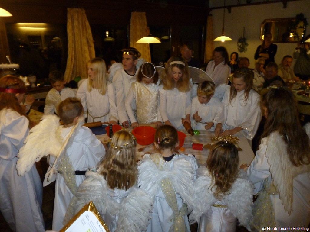 Am Samstag, 13. Dezember luden die Pferdefreunde im Rupertiwinkel e.V. Fridolfing zu ihrer Weihnachtsfeier im Gasthof Raab in Götzing ein, zu der zahlreiche Mitglieder erschienen. Mit „Let’s play“ begrüßten die Kinder vom Verein Lukas, Johanna, Raphael und Stefanie mit Saxophon, Klarinette und Trompeten alle Anwesenden. Nach der Begrüßung durch Vorstand Franz Mayer folgte ein abwechslungsreiches Programm. Der seit Jahren bestehende Pferdefreunde-Chor zeigte sein Können mittels eines bairischen, deutschen, englischen sowie afrikanischen Liedes. Mit Gitarre, Flöten und verschiedenen Rhythmusinstrumenten wurde der Chor begleitet und bot ruhige, wie auch schwungvolle Lieder dar. Als Josef Stettmeier und Hans Günther je eine Weihnachtsgeschichte vorlasen, wurde es ganz still im Raum und alle lauschten gespannt dem Vortrag. Die Schwestern Maria und Theresa spielten souverän auf der Altflöte zusammen mit Luisa am Cello und wurden von Margit Stettmeier mit der Bassflöte und Elisabeth Leitner mit der Harfe begleitet. Rockig wurde es, als Felix und Lukas mit Schlagzeug und E-Gitarre „Little drummer boy“ und „So this is christmas“ zum Besten gaben. Caroline spielte anschließend „Weihnachtszeit“ auf ihrer Gitarre und sang dazu, begleitet von den Sängerinnen Maria, Theresa und Lena. Christa Kräbl hat sich wie jedes Jahr wieder ein besonderes Gedicht überlegt, welches sie vor dem gemeinsamen Schlusslied „Es wird scho glei dumper“ vortrug. Nach dem Essen tauchten die vielen Kinder vom Verein als Engerl auf und versammelten sich um einen Tisch, an dem sie Teig kneteten, ausrollten und zu Plätzchen formten. Caroline las als Erzählerin gekonnt aus ihrem goldenen Buch vor und führte das Publikum durch die Geschichte. Vorstand Franz Mayer durfte die Rolle des Petrus übernehmen, der seinen Himmelsschlüssel verloren hatte. Obwohl er den Engerl strengstens verboten hatte, zu naschen, konnte er selbst der Versuchung nicht widerstehen und schlich sich heimlich in die Backstube. Petrus Nascherei kam heraus, als die Engerl den Schlüssel in der Teigschüssel fanden. Am Ende des Stücks ernteten die jungen Schauspieler viel Applaus. Noch war die Weihnachtsfeier nicht zu Ende: Vereinsspione haben das Jahr über gut aufgepasst und sich lustige Ereignisse notiert, die Martina Otter-Huber, Angela Schörgnhofer, Franz Kräbl und Franz Mayer in Form eines gereimten Jahresrückblicks vortrugen. Am Ende wünschte Vorstand Franz Mayer eine besinnliche Weihnachtszeit und die Pferdefreunde ließen die Weihnachtsfeier bei gemütlichem Beisammensein ausklingen.