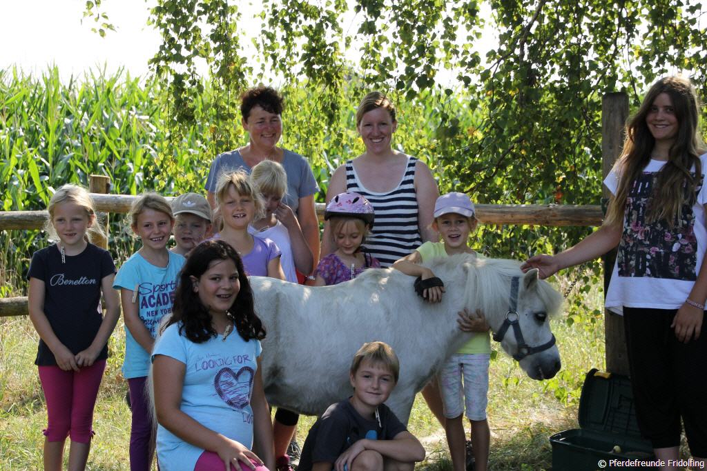 Am Freitag, 14. August luden die Pferdefreunde im Rupertiwinkel e.V. Fridolfing gut 45 Fridolfinger Kinder zum alljährlichen Ferienprogramm auf den Reitplatz nach Fridolfing ein. Bei bestem Sommerferienwetter versammelten sich alle Teilnehmer auf der Wiese, wo Jugendwartin Hanna Steinmaßl alle begrüßte, ehe die Kinder in verschiedene Gruppen eingeteilt wurden. Verschiedenste Stationen rund ums Pferd standen nun auf dem Programm: drei Ponys standen zum Streicheln und Putzen parat, die Kinder zeigten ihr Glück im Hufeisenwerfen, ein Pferde-Quiz ging quer über den großen Wiesenreitplatz, eine Kutsche fuhr die Ferienprogrammteilnehmer durch Fridolfing, Pferdemandalas konnten bunt ausgemalt werden und als Highlight durften alle Kinder ein paar Runden reiten. Dazu standen vier Pferde parat, die die strahlenden Kinder auf ihrem Rücken trugen. Nach einer kleinen Stärkung fand zum Schluss ein Wettbewerb statt, bei dem die Kinder auf einem Steckenpferd durch einen Parcours reiten mussten. Dabei sollten sie Wasser in einem Becher transportieren und im Ziel in einen Eimer schütten. Die Gruppe, die am Ende mehr Wasser im Eimer gesammelt hatte, war Sieger. Nach einem aufregenden Vormittag kehrte wieder Ruhe am Fridolfinger Reitplatz ein.