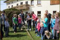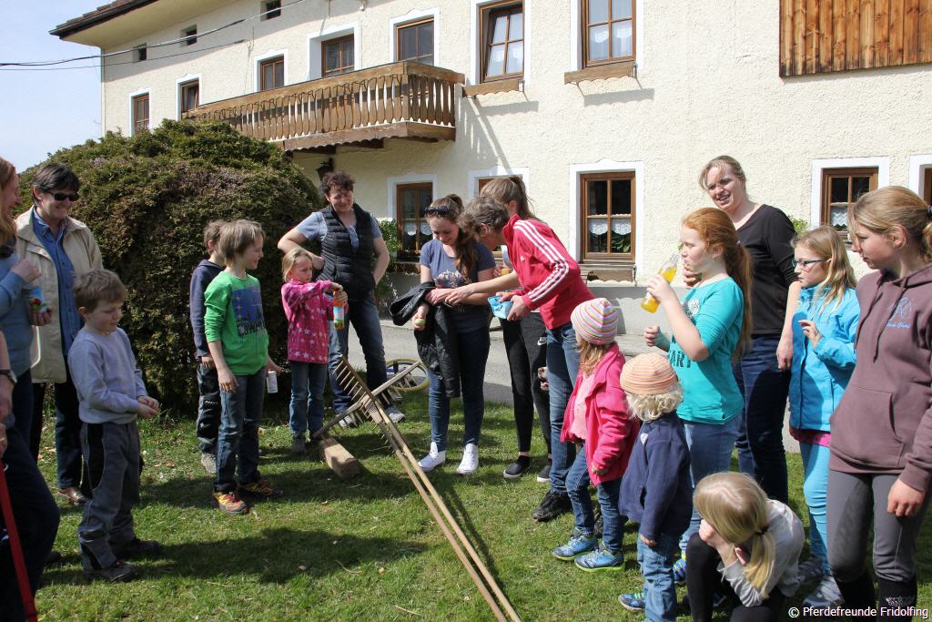Die Pferdefreunde im Rupertiwinkel e.V. Fridolfing trafen sich spontan mit den Vereinskindern in Enhub bei Familie Stettmeier, um den bairischen Brauch „Oascheim“ auszuüben. Jeder kam mit einem bunt gefärbten Osterei und ein paar Centstücken ausgestattet zum Treffpunkt, um beim Oascheim mitzumachen. Zuerst wurden zwei Holzrechen ineinander verhakt, so dass eine Bahn zum Hinunterrollen der Eier entstand. Nach und nach durfte jeder sein Ei hinunter rollen. Anschließend wurde jeweils auf das Ei ein Centstück gelegt. Wer ein Geldstück zum Runterfallen brachte, durfte es sich behalten. Dadurch entstand eine riesen Gaudi. Zwischendurch stärkten sich die Pferdefreunde mit belegten Broten, Getränken und Kuchen auf der Sonnenbank.