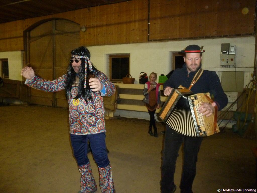 Das ganze Jahr über findet immer montags das Therapeutische Reiten der Pferdefreunde im Rupertiwinkel e.V. Fridolfing unter Leitung von Gertraud Forster statt in der Reithalle der Familie Meindl in Rothanschöring statt. Auch am Rosenmontag trafen sich die Reiter und Betreuer des Therapeutischen Reitens. Dieses Mal aber war ein besonderer Montag, da neben den Therapiereitern und deren Familien auch weitere Mitglieder der Fridolfinger Pferdefreunde erschienen waren, um den Therapiereitern beim Reiten zuzusehen. Alle kamen verkleidet und präsentierten die raffiniertesten Verkleidungen. Außerdem gab es verschiedene Snacks und Süßigkeiten sowie Getränke, um nach dem Reiten in geselliger Runde Fasching zu feiern. Auch Vorstand Franz Mayer ließ es sich nicht nehmen und kam als Hippie maskiert, um sich der Faschingsfeier anzuschließen. Er überraschte das Team des Therapeutischen Reitens mit Musik: der Vorsitzende wurde von Matthias Winkler begleitet, der mit seiner Ziach und zünftiger Musik dazu beitrug, dass es ein lustiger und unterhaltsamer Faschingsabend wurde. Zur Musik wurde geklatscht und getanzt, ja sogar eine Polonaise mit Pferd wurde quer durch die Reithalle geführt.