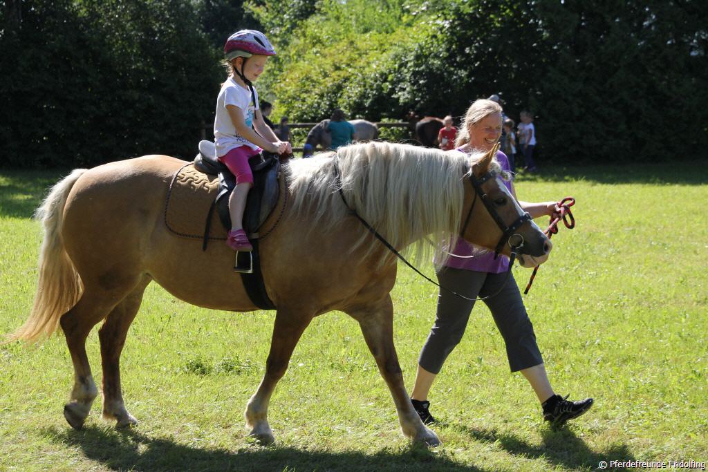 Fridolfing. Am Montag, 08. August luden die Pferdefreunde im Rupertiwinkel e.V. Fridolfing fast 50 Fridolfinger Kinder zum alljährlichen Ferienprogramm auf den Reitplatz nach Fridolfing ein. Bei bestem Sommerferienwetter versammelten sich alle Teilnehmer auf der Wiese, wo Jugendwartin Hanna Steinmaßl alle Kinder begrüßte und den Ablauf erklärte. Verschiedenste Stationen rund ums Pferd standen nun auf dem Programm: zwei Ponies standen zum Streicheln und Putzen parat, die Kinder zeigten ihr Glück im Hufeisenwerfen, ein Pferde-Quiz ging quer über den großen Wiesenreitplatz, eine Kutsche fuhr die Ferienprogrammteilnehmer durch Fridolfing, Pferdemandalas konnten bunt ausgemalt werden und als Highlight durften alle Kinder ein paar Runden reiten. Dazu standen vier Pferde parat, die die strahlenden Kinder auf ihrem Rücken trugen. Nach einer kleinen Stärkung fand zum Schluss ein Wettbewerb statt, bei dem die Kinder Wasser durch einen Parcours balancieren mussten. Die Gruppe, die am Ende mehr Wasser gesammelt hatte, war Sieger. Nach einem aufregenden Vormittag kehrte wieder Ruhe am Fridolfinger Reitplatz ein.