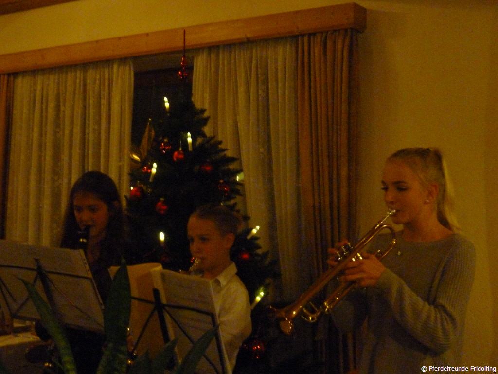 Am Samstag am ersten Adventswochenende luden die Pferdefreunde Fridolfing zur alljährlichen Weihnachtsfeier ein, die beim Gasthof Gruber in Pietling stattfand. Viele Mitglieder waren bereits eineinhalb Stunden vor dem offiziellen Beginn der Feier eingetroffen, da es einiges aufzubauen und vorzubereiten gab. Um halb acht Uhr eröffnete die junge Bläsergruppe des Vereins (Raphael Stettmeier, Luisa und Lukas Schnurpfeil, Johanna Wolferstetter und Stefanie Heiß) mit „Tochter Zion“ feierlich den besinnlichen Teil der Weihnachtsfeier. Mit „A Liacht in da dunklen Zeit“ setzte der Chor der Pferdefreunde fort, der von Philipp Reuber auf der Gitarre sowie von Kerstin Reuber und Margit Wolfgruber auf verschiedenen Flöten begleitet wurde. Anschließend begrüßte Vorstand Franz Mayer die vielen Anwesenden, freute sich über so zahlreiches Erscheinen und wünschte einen besinnlichen und unterhaltsamen Abend. Er bat, den Applaus zwischendurch auszusetzen und für den Schluss aufzusparen. Sogleich setzte er mit einem Gedicht fort, das zum Nachdenken anregte.