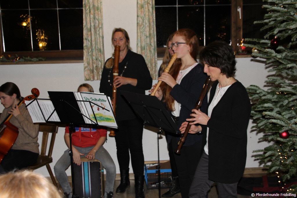 Am Samstag am dritten Adventswochenende luden die Pferdefreunde Fridolfing zur alljährlichen Weihnachtsfeier ein, die beim Dorfwirt in Fridolfing stattfand. Viele Mitglieder waren bereits eineinhalb Stunden vor dem offiziellen Beginn der Feier eingetroffen, da es einiges aufzubauen und vorzubereiten gab. Um acht Uhr eröffnete das Ensemble „Saitenflöter“ mit der „Musik zum Einzug feierlich den besinnlichen Teil der Weihnachtsfeier. Anschließend begrüßte erster Vorsitzende Franz Mayer die vielen Rosserer in der festlich geschmückten Rupertihalle. Er bat, den Applaus zwischendurch auszusetzen und für den Schluss aufzusparen und wünschte eine besinnliche Feier. Mit „Sing ma im Advent“ setzte der Chor der Pferdefreunde fort, der von Michael Schnurpfeil auf der Gitarre sowie von Sophia Osl und Margit Wolfgruber auf verschiedenen Flöten begleitet wurde. Angela Schörgnhofer setzte mit einem weihnachtlichen Gedicht im Programm fort, bevor „Volio“ von den Saitenflötern, bestehend aus Luisa Schnurpfeil und Franziska Gaube (beide Cello), Regina Gaube, Teresa, Maria und Margit Wolfgruber (Flöten), Michael Schnurpfeil (Gitarre) sowie Elisabeth Leitner (Harfe), zum Besten gegeben wurde. Gerlinde Berger las nun eine Geschichte vor, die sehr zum Nachdenken anregte. Dem Lied „In the Bleak Midwinter“ des Pferdefreunde-Chores folgte „Musik zur Freude“ von den Saitenflötern, die von Raphael Stettmeier mit der Trompete begleitet wurden. Eine heitere Weihnachtsgeschichte trug nun Vorstand Franz Mayer vor und der Chor folgte mit „Und Freude wird weit“. Das Abschlusslied „ O du fröhliche“ wurde von Raphael Stettmeier auf der Trompete angestimmt und alle sangen mit.