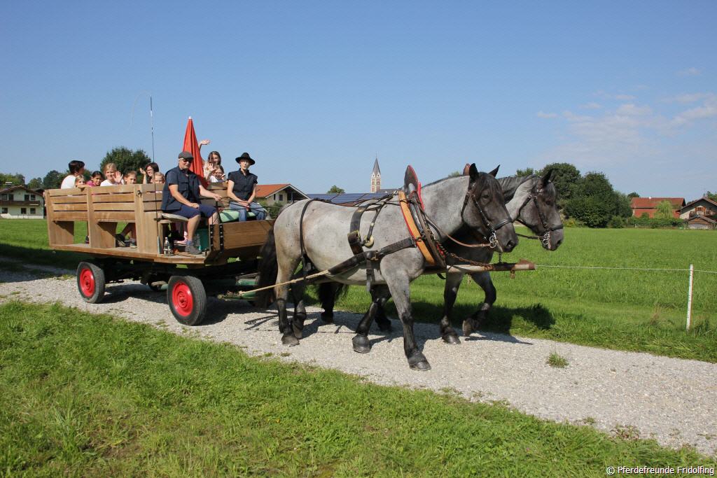 Am Mittwoch, 11. August luden die Pferdefreunde im Rupertiwinkel e.V. Fridolfing über 40 Fridolfinger Kinder zum alljährlichen Ferienprogramm auf den Reitplatz nach Fridolfing ein. Bei bestem Sommerferienwetter versammelten sich alle Teilnehmer auf der großen Wiese, wo Elisabeth Leitner von den Pferdefreunden alle Kinder begrüßte und die Regeln sowie den Ablauf des Vormittages rund ums Pferd erklärte. Verschiedenste Stationen standen nun auf dem Programm, die die Kinder, aufgeteilt in Gruppen, durchliefen. So standen zwei Haflinger sowie zwei Esel zum Streicheln und Putzen parat, die Kinder zeigten ihr Glück im Hufeisenwerfen, ein Parcours mit Hindernis und Slalom war auf der großen Wiesen aufgebaut, den die Kinder mit einem Becher voll Wasser durchliefen, eine Kutsche fuhr die Ferienprogrammteilnehmer durch Fridolfing, Pferdemandalas konnten bunt ausgemalt werden und als Highlight durften alle Kinder ein paar Runden reiten. Dazu standen vier Pferde parat, die die strahlenden Kinder auf ihrem Rücken trugen. Viele der Kinder wollten sogar die schnellere Gangart Trab ausprobieren und zeigten schon viel Sicherheit auf dem Pferderücken. Nach einer kleinen Stärkung durfte sich jedes Kind als Andenken an das Ferienprogramm der Pferdefreunde ein Hufeisen mit nach Hause nehmen.