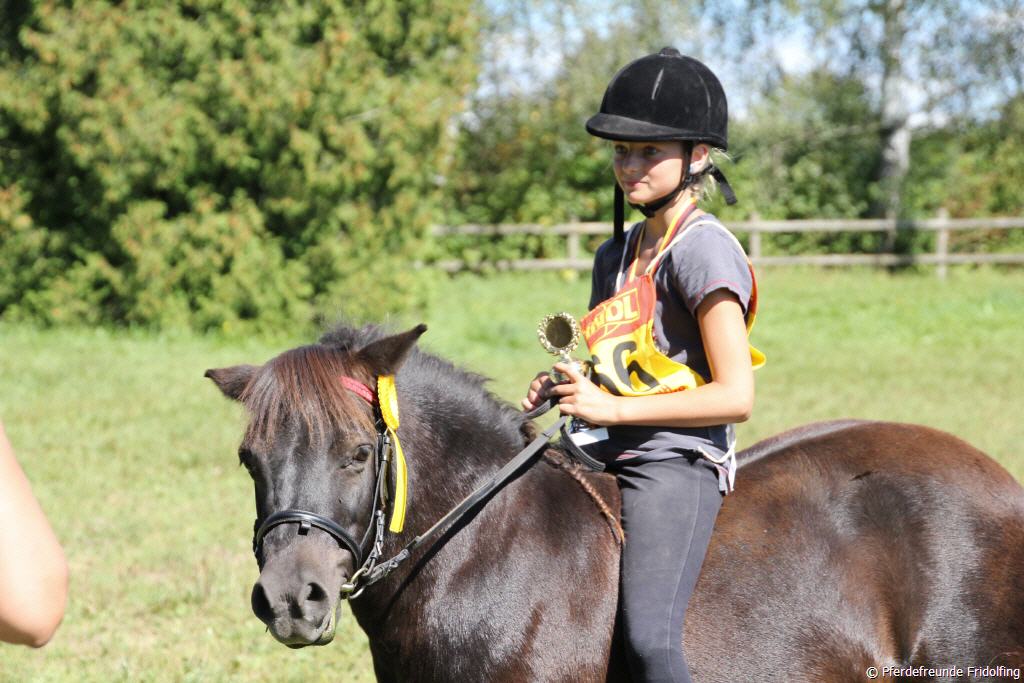 Schon bald ertönte Siegermusik wie auf einem richtigen Turnier und die Sieger wurden bekannt gegeben. Siegerin bei den selbstständigen Reitern wurde Madeleine Lindner mit Trixie. Bei den geführten Kindern konnte Laura Egger mit Angelina gewinnen.